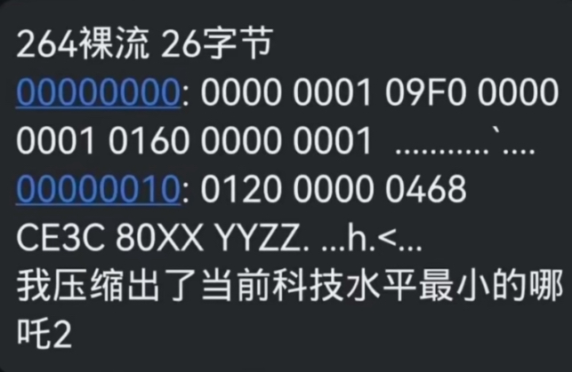 还有网友将H.264编码哪吒2压缩成仅有26个字节的裸流数据。(通常视频会封装在比如MP4、MKV等容器格式,而未经封装的原始数据就被称为裸流,裸流通常用于调试、分析或特殊用途,不能直接播放)